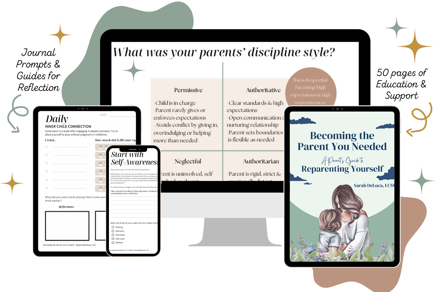 Becoming the Parent You Needed is a 50-page workbook designed for parents who want to reflect on their own childhood & how it impacts their current parenting. The workbook provides educational information & guided journal prompts for reflection & healing.